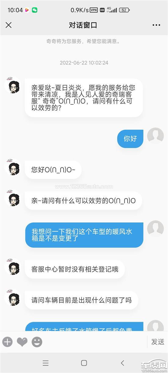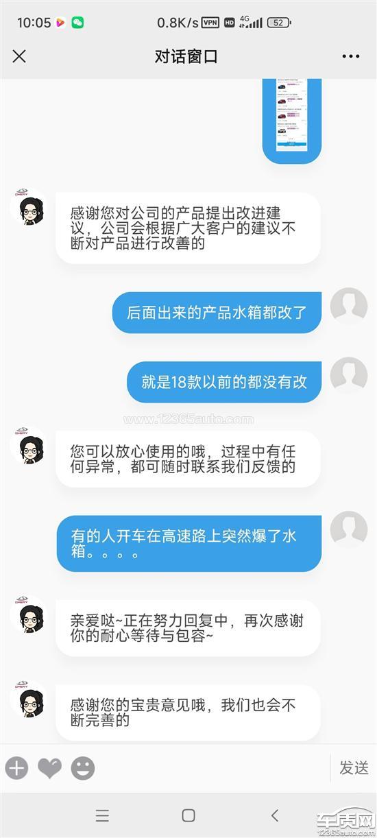 奇瑞瑞虎3x水箱损坏存在质量问题2022-06-12车型:2018款 1.5L 手动 精英版