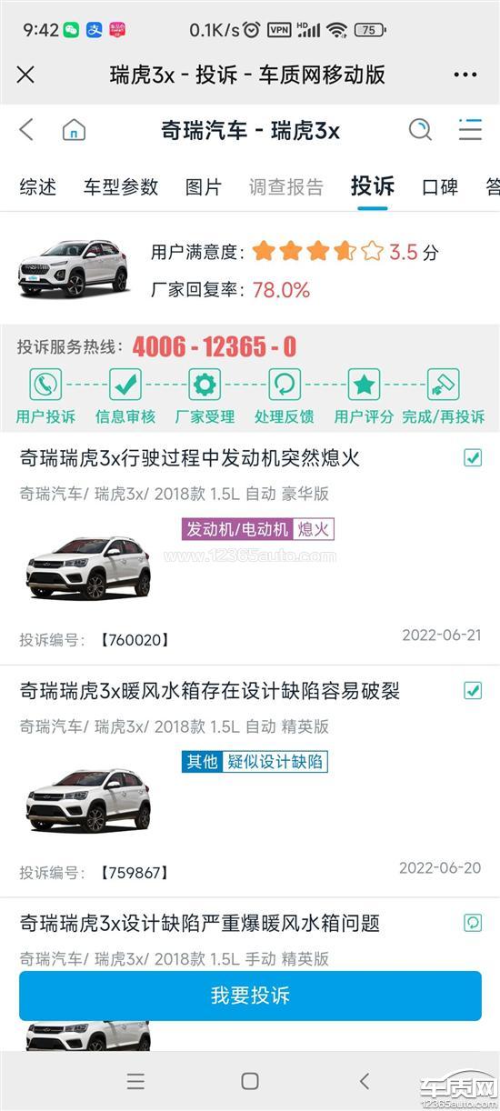 投诉编号:【760671】 投诉时间:2022-06-22 10:46 投诉品牌:奇瑞汽车 投诉车系:瑞虎3x 投诉车型:2018款 1.5L 自动 精英版