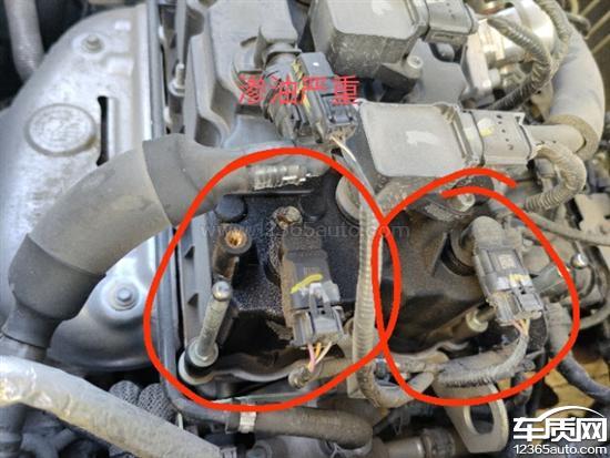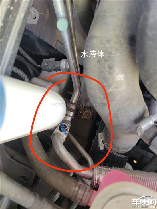 发现发动机图片标注处渗油严重,漏油痕迹来看应该有很长一段时间了,刚下高速后打开同时机舱内有水液体。