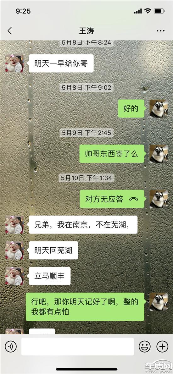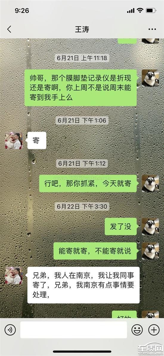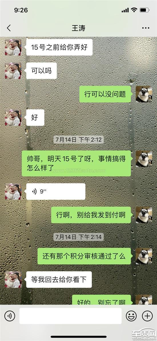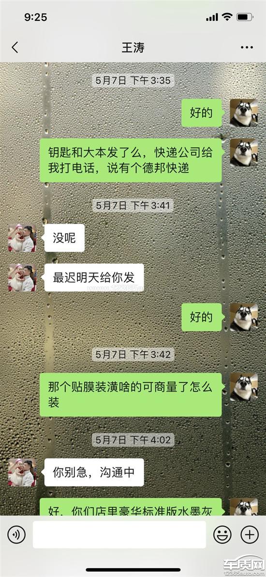 篇幅所限,只能发六张照片,无法展现完整的沟通记录,总的来说,买车将近三个月,从大本催了七八次才给发,购车答应的膜脚垫记录仪和置换积分,两个多月催了多少次我都记不清,一直没发。这是一个销售的服务态度?活了二十多年第一次看到这样的,买完车当天跟我说大本第二天寄给我,你自己问他,我催了几次,中间过了多长时间才寄给我。这个膜、脚垫、记录仪,说后面寄给我,你自己问他,中间催了可有十几次,两个多月,还没有寄。这马上再过几天都三个月了,7月5号的时候又跟我说15号之前不管是积分还是赠品什么的都给我办妥,到15号,我要是不问,一个屁都没有,我问了,说办,办到现在呢,月底了,还是什么都没搞,到19号的时候,我讲正好有个朋友今天去那边,要不我让他去店里帮我拿一下,结果跟我说快递早拿走了,我还寻思着终于办好了,结果呢,今天25号了,没收到,从芜湖到合肥寄个快递要一周?积分的事一直跟我说等,自己说到15号之前给我搞好,搞好了么,现在跟我说等厂家邮件答复?我不是没买过其他品牌的车,等厂家邮件答复要一周?又不是需要零配件需要整改需要研发设计要等那么长时间,搁这糊弄鬼呢。我问的其他车友,说是两个月内积分到账,问的官方客服说是购车日期+50天是积分到账日期,这个日期也早过了,就从赠品磨磨唧唧说了十几次讲寄都没寄,这还有可信度么,是不是可以怀疑,压根没向厂家上报置换补贴积分的材料。这是一个豪华品牌的服务态度?我的时间不是时间?还有提完车跟我讲异地提车给我补个来回路费,讲完之后这么久,一个屁都没有,你要么别说,说了就得做到。还有办按揭,去之前跟我讲利息三千来块钱,去了之后就成了四千多,自己问他,我去之前是不是跟他沟通过,利息到底是多少钱,一口咬定跟我讲三千多,当时呢,我这两百多公里跑过去,也没必要为了这一千多再跑回来,再加上销售自己当时跟我说后面会寄跟这个多出来的利息差不多等值的赠品给我,我也就没计较那么多了,这么长时间过去了,你问他赠品寄了么,跟那个油费一样的,屁都没一个。