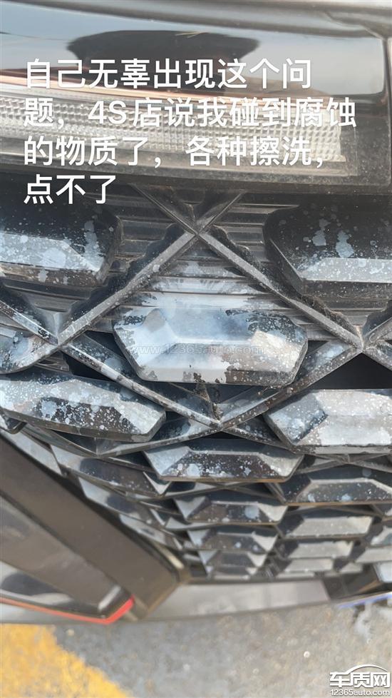 去永年4S店看过,技师说是被东西渗进去了,当时不懂,以为自己的原因,后来细想塑料件表面光滑无任何腐蚀痕迹,塑料是个稳定的材质,不和别的物质起化学反应,但是到8.7号我早上看车的时候发现痕迹消失了,我觉得是中网材质问题,在生产过程中被某些物质喷溅后,时间长从内部泛出来了。要求更换中网格栅。