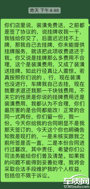 2022年7月31日,我与被投诉对象订立汽车预售合同,约定购买该店出售的奥迪A3中配汽车,裸车价款,178000元(大写:拾柒万捌仟元整),免费赠送装修礼包,价值2800元(整车玻璃贴膜、全包脚垫及后备厢垫子、专车专用隐藏式行车记录仪),委托挂牌1000元。并于当场缴纳五千元定金。2022年8月8日,我前往投诉对象所在地,在签订了一系列材料后(销售并未让仔细查看),缴纳裸车款剩余173000元及1000元挂牌费用,并向销售人员转交车辆交强险及商业险款项7861.14元。后于当日将涉案车辆提走。但是后面关于挂牌事宜,销售一拖再拖,我便自行前往车管所办理挂牌事宜并缴纳了购置税。现,1.要求投诉对象退还挂牌费1000元;2.按照合同要求免费加装装潢包;3.返还我签订的购车协议及销售合同(合同应一式两份,但是投诉对象并为给我上述合同)。