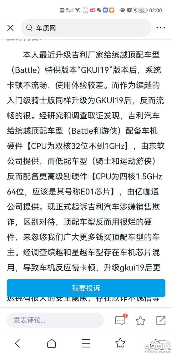 我买的battle版的车机比中低配骑士版这些配置还要差,车机流畅度还比不上中低配的,买顶配的是冤大头吗?以前投诉吉利不给升级宣传上说的gkui19,因为投诉人太多,配置又太差,吉利随便搞了个换皮不换心所谓特供版gkui19应付缤越车主,10几年前的双核处理器还是32位的,1G赫兹都不到的处理器,怎么用?不指望吉利免费给缤越车主更换车机,最起码你们要出个方案,哪怕我贴钱去换也好,领克都能贴钱换?缤越车主想贴钱都没门。最后想说吉利真不厚道,区别对待。