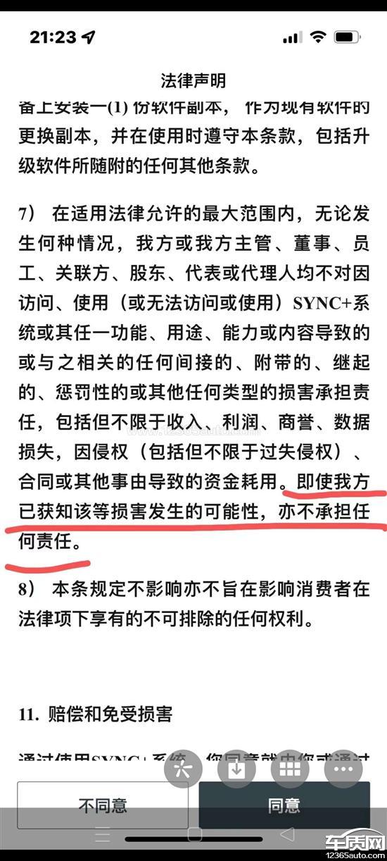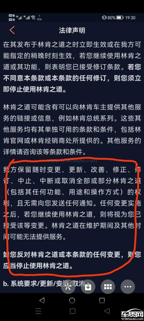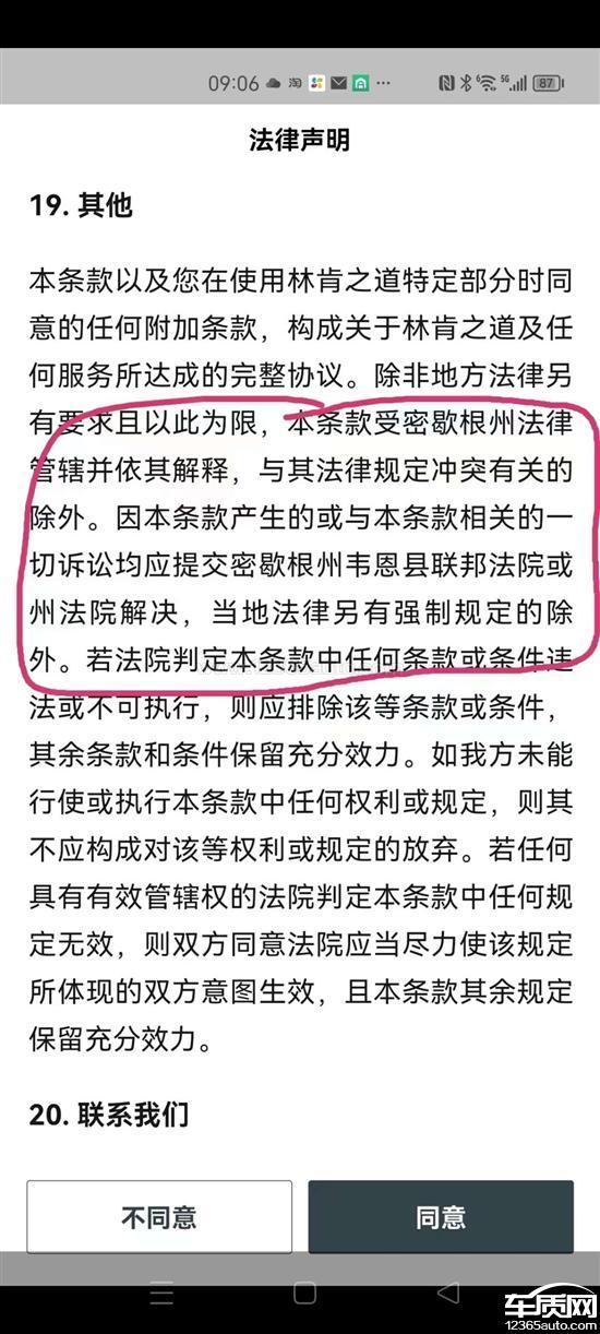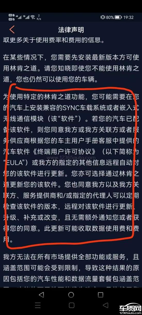 APP法律声明是霸王条款,完全不尊重车主;不同意就退出,只有点击同意才能使用,如果点击不同意就退出APP,导致车辆配置中的“远程启动”等远程控制无法使用,侵犯消费者应有的权益;歧视中国消费者,还说与法律声明有关的诉讼由美国相关法院判决,言外之意在中国发生的纠纷不受中国法律约束了;购车时也没有提及APP将来会收费,林肯之道没有征询车主随意更改条款,疑似将来有收费倾向。诉求:要求林肯改正错误,尊重中国消费者,不得侵害消费者的权益,购车时的配置不管同不同意法律声明都应该能使用,立即停止疑似收费声明。