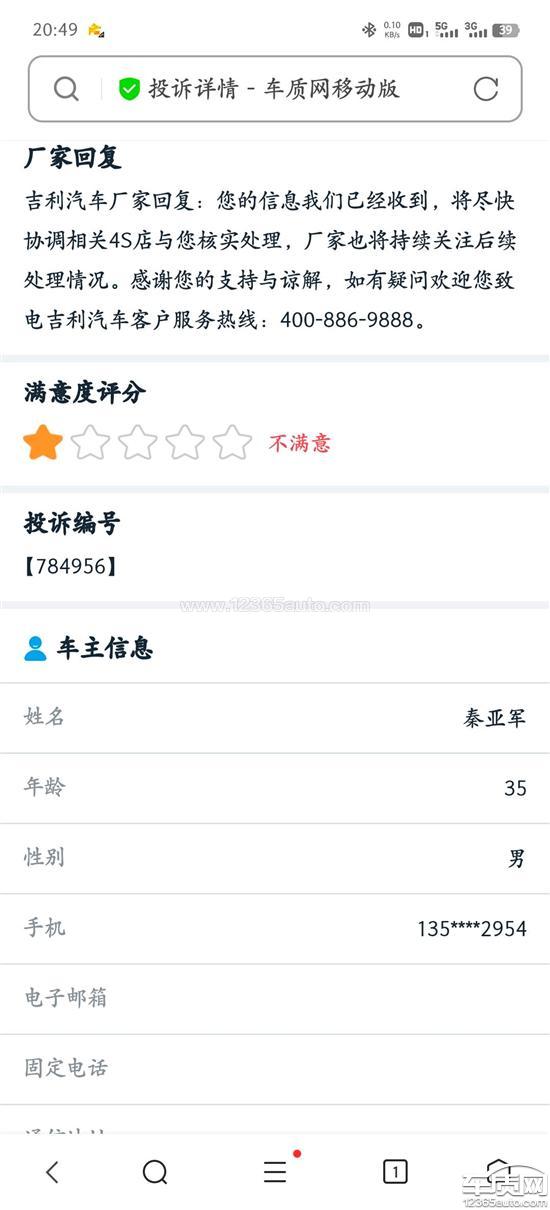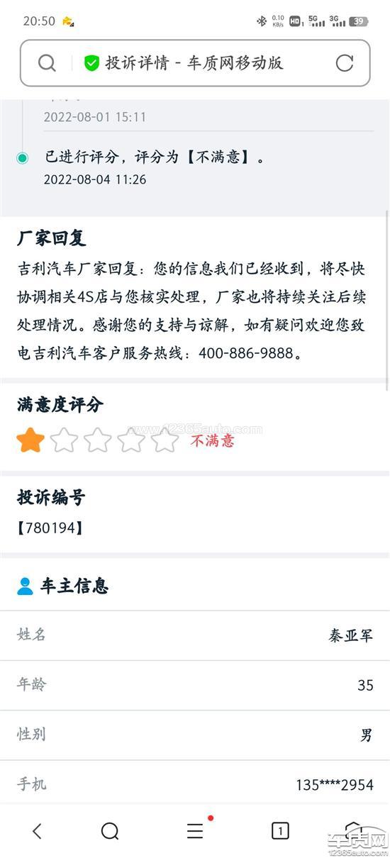吉利汽车厂家回复:您的信息我们已经收到,将尽快协调相关4S店与您核实处理,厂家也将持续关注后续处理情况。感谢您的支持与谅解,如有疑问欢迎您致电吉利汽车客户服务热线:400-886-9888。