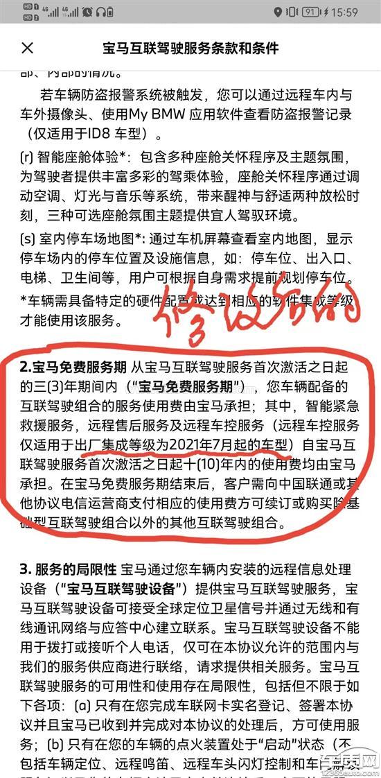 随意修改服务协议,原远程车控服务免费十年,宝马随意修改服务协议,未经消费者同意,于2022年7月将尊享型互联网组合远程车控服务的协议单方面进行修改,将原来适用的免费服务十年的车辆范围修改为仅限于生产日期为2021年7月之后的车辆,本人车辆免费服务期只剩3年,本车辆以后得花费购买远程服务,属于单方违约行为,严重侵害消费者权益,要求恢复十年免费服务。