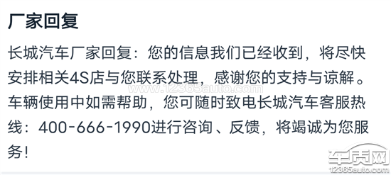 长城汽车厂家回复:您的信息我们已经收到,经销商已向您解释说明相关问题,感谢您的支持与谅解。车辆使用中如需帮助,您可随时致电长城汽车客服热线:400-666-1990进行咨询、反馈,将竭诚为您服务!