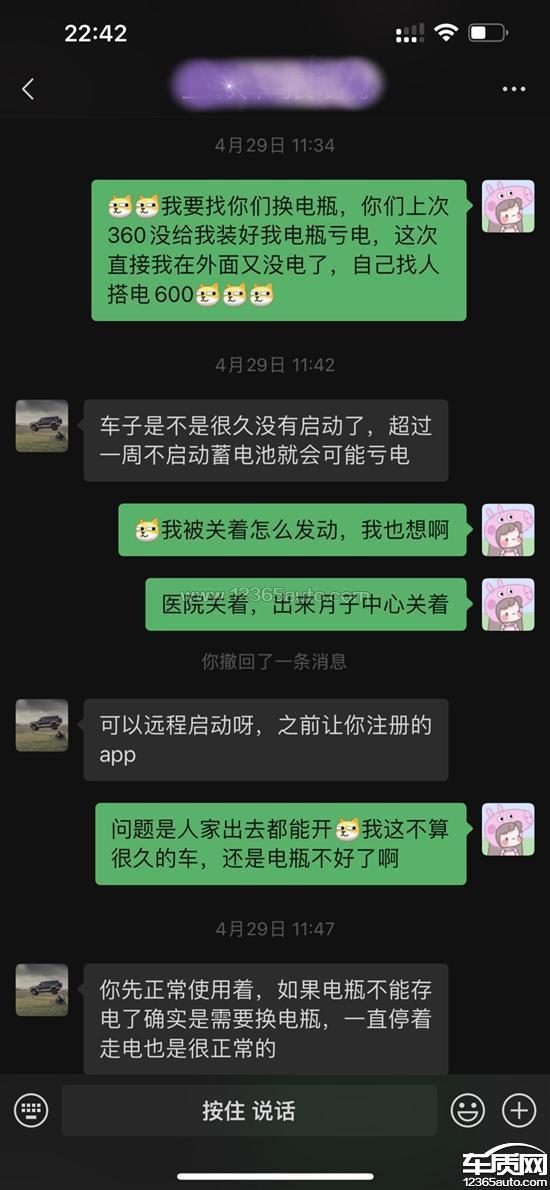 车辆去年2月购入,4s店安装360后,去年8月后车子无法启动,显示电瓶没电,后面4s店沟通后说是360线路造成电瓶亏电,并表示已经处理好了。后续经常提示蓄电池电量低,无法启动,每次送检4s都说电瓶没问题,不肯更换电瓶,今日车辆尾灯邻居发现亮着提醒我,我去看了电瓶又没电了,只能晚上叫拖车送去4s店,现在要求彻底检查是否存在漏电现象并要求更换电瓶。