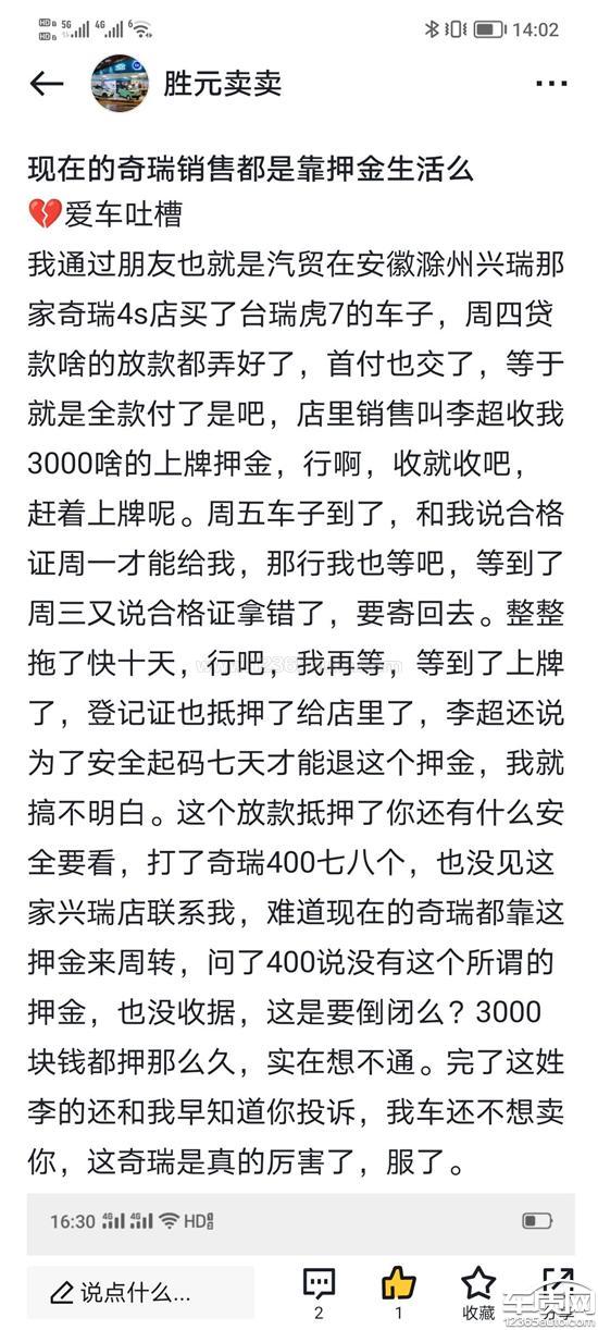 店里销售李超就一句话,这钱我就是押你这么长时间,你别管我是奇瑞收的还是我收的,早知道你要投诉,押金接受不了五天,我就不卖车给你,现在奇瑞都要靠这三千块钱过日子了么。