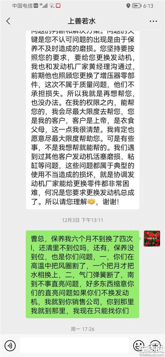 一次发动机温度过高,处理结果:修理了一个月,在高温中把风圈割了,一个月的时间才把水箱换上。一次向售车处反映退档进挡不行,处理结果:换了牙箱和方向机。一次向售车处反映离合片和压盘,处理结果:换的新的。一次向售车处反映助力棒方向打不起,处理结果:换的助力棒。一次向售车处反映增压机问题,处理结果:换的增压机。一次向售车处反映发动机烧机油气门弹簧已断,处理结果:一直未解决这个问题。综上所述质量问题,要求换发动机,现在持不回应的态度。