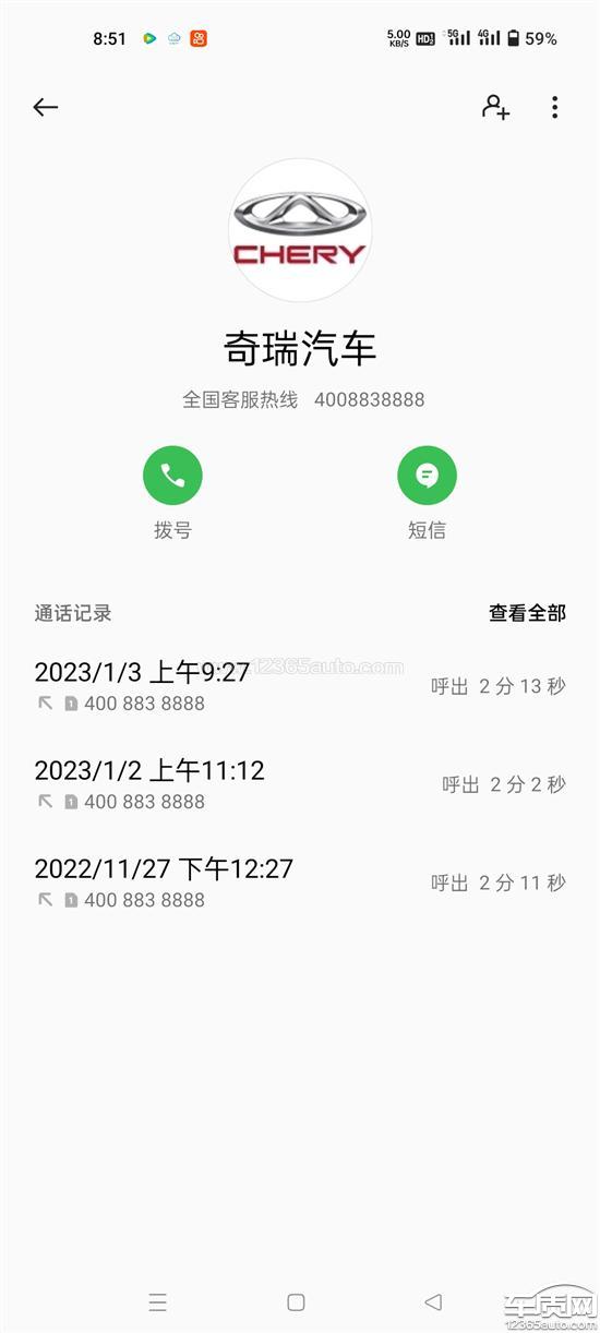 奇瑞汽车厂家回复:“接到贵网反馈的客户信息后,我司非常重视:据我司海口智晨4S店反馈:已及时联系客户邀约进站处理。具体车辆问题,会积极排查处理。我司会继续做好对该车的跟踪服务,为客户提供周到的售后服务和保障。同时也非常感谢客户对奇瑞汽车的关注和支持,衷心祝您生活愉快,工作顺利!“