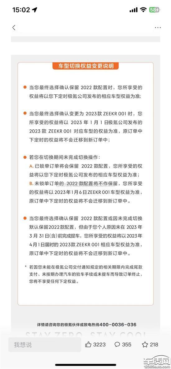 2022.8月从极氪app5000元购买订单后,极氪销售并未提及具体锁车以及提车时间,销售以及官网并未提及2023年之后的改款车型。2023年1月1日,极氪官网发布新车,取消整车终生质保,并增加多项霸王条款,比如要求购买方于2023年1月6号前锁单且必须2023年3月31日前提车,不然无法享受2022款车型的相应权益,并修改合同,这属于欺诈消费者。我的诉求就是:退订金。