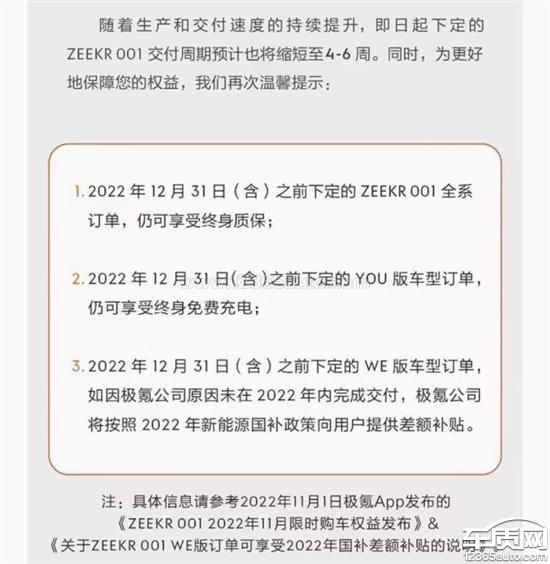 我于2022.12.17下定极氪001当时销售代表极氪承诺2022年下定的车子在订单有效期内提车就可以享受终身质保(订单有效期为365天)并且极氪厂家将承担12600元的国补,12月官方也是这样宣传的但是2023.1.1极氪发布公告要求2022年下定的客户如果想要国补和终身质保必须在2023.3.31日前提车否则自动变为2023款车型(厂家不承担国补没有终身质保)与下定时官方承诺的政策不符强迫用户二选一,本人现在对极氪已经没有任何信任可言要求极氪退定金。