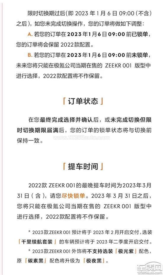 极氪厂家回复:根据极氪1月6日最新公告内容,极氪为2023年1月1日9:00前下定未排产的用户开放了车型切换的机会。对于1月6日9:00前已做出车型切换选择并锁单的用户,极氪将尊重用户选择,不做任何调整。对于在1月6日9:00前未锁单或未做出车型切换选择的用户,极氪将持续开放车型切换选择。具体内容请您参考极氪发布的公告或咨询您的极氪伙伴。