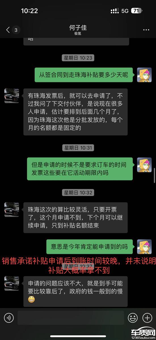 交易过程:我于2023年2月18日前往深圳极氪空间进行试驾,试驾后销售告知了目前的优惠方案(见附件中的图片),介绍现在下单可以享受珠海市地方补贴5000元,并在晚上以当天下单送SK2为由诱惑我当天下单。在店里试驾以及下单前我都给销售说过需要的型号,下单后也答应会锁住该型号,但之后却告知该型号售完。在签署购车合同钱,极氪方的交付打电话(此处忘记录音)告知我珠海市补贴到我这里基本是没有的,与此前销售给的优惠方案不一致,因此本人要求退还定金。问题:1.销售在下定前的说法与下定后签署购车合同前说法不一致,优惠方案和实际宣传的方案存在差异;2.下定前本人要求的型号销售答应锁住,实际下单后需要的型号已售完。诉求:退还5000定金。