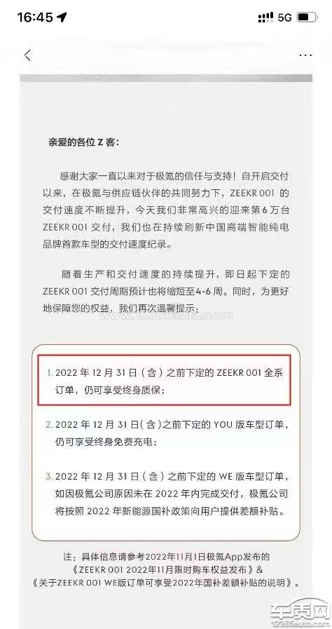 极氪厂家回复:根据极氪3月9日最新公告:2023年1月1日9:00(不含)前下定,且订单状态及相关描述符合条件的ZEEKR001订单,可以在2023年5月31日前完成退定申请**。退定申请发起前,您订单详情页面显示的状态及相关描述须为以下之一:1.定金已支付2.已锁单3.已确认(仅限详情显示为“极氟宇宙已确认您的订单,让我们一起开启共创之旅吧。”的情形)