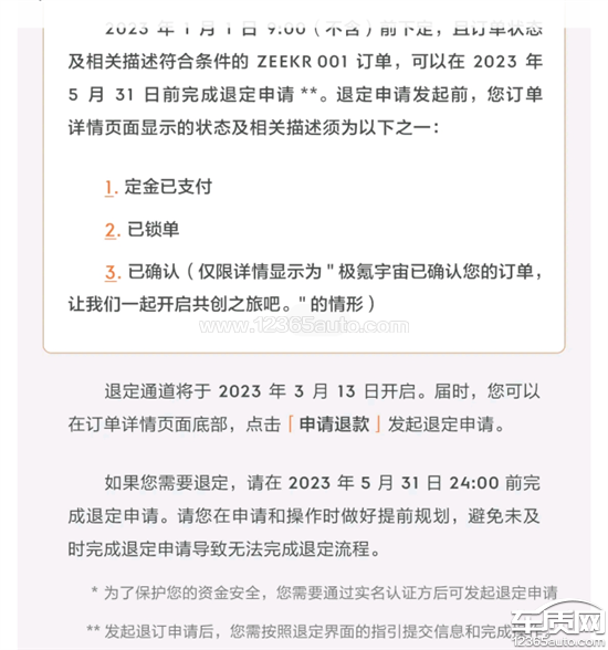 2022年12月份锁单全款购车无任何优惠(免息及积分奖励),2022年12月31日提车,2023年1月1日车辆改款,此前无任何改款消息,改款车辆实际为将之前收费选装的配置变更为免费配置,过完年后出现了全款购车送15万积分和空悬打折蓝色车漆免费以及免息等优惠,3月10日左右官方开启了定单退订通道,但我此前11月份的另一份定单发现被取消无法退款。3月16日仅仅在315后一天官方开启了2万元的选装优惠并对2023款的车主补偿10W积分,2022年12月31日前的车主无任何优惠。12月底提的车仅仅两个月车辆因为官方行为已经掉价五万元以上,另一份定单的5000元定金官方也以取消定单不予退回。要求极氪官方给予2022款车主一定补偿并退还另一份定单的定金5000元。