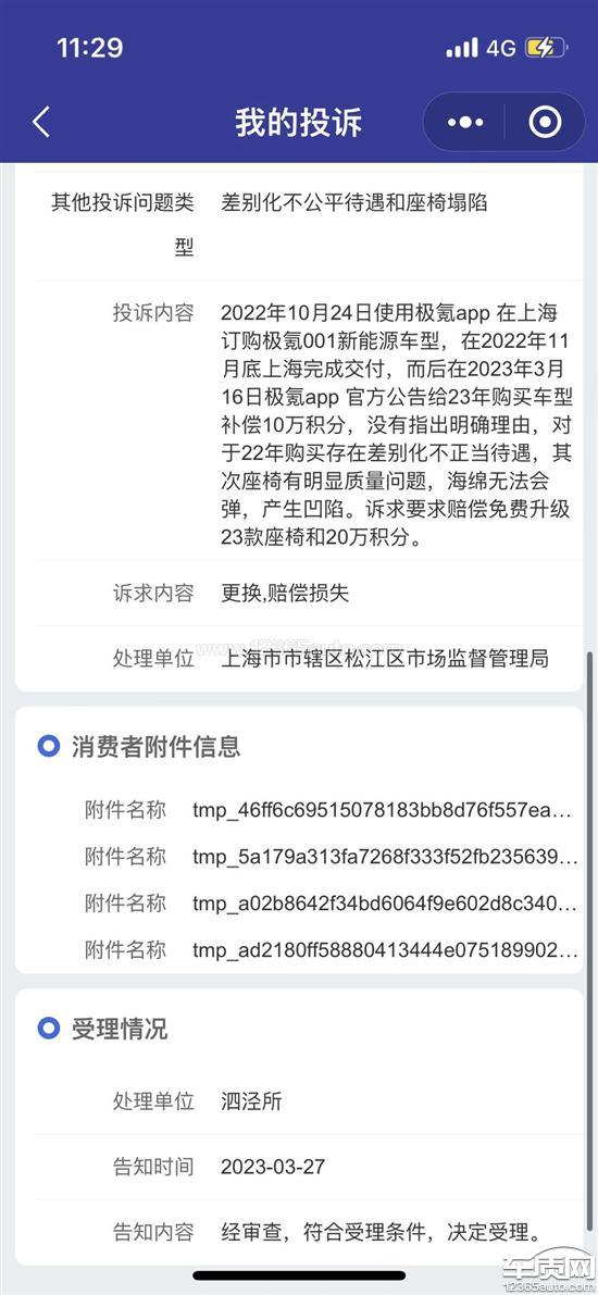 乘坐后座椅塌陷且无法回弹,明显质量问题,不接受更换现有海绵方案,因为更换后仍无法解决,同款的车友已碰到过该问题,诉求更换23款座椅材质。2022年10月24日使用极氪app在上海订购极氪001新能源车型,在2022年11月底上海完成交付,而后在2023年3月16日极氪app官方公告给23年已购车用户补偿10万积分,其中没有指出明确理由,对于22年购买存在差别化不公平待遇,诉求:更换23款座椅材质及20万极氪APP的积分。目前315已受理此案件,车质网可以同步跟踪并反馈商家,目前315已确定诉求和投诉内容属实。
