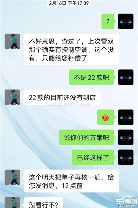 2021年12月16日微信订车,提车订购车辆型号:2022款丰田雷凌1.2T运动版;已发销售合同;2021年12月16日13.12分微信与销售人员确认是否22款到货,2021年12月18日10:14分销售人员微信回复:已核实,库里边的雷凌有远程空调控制功能,让下周直接办手续;2022年1月2511:54预约提车;2022年1月2612:00左右到店提车;2022年1月2615:28微信询问车辆合格证何时给?2022年2月7追问车辆app2022年2月8日9:08让开通车辆丰云行app;9:30左右办理后询问车辆远程控制功能在哪里操作?回复说查一下2022年2月9日9:05第一次询问说确认;2022年2月9日11:52第二次询问无回复;2022年2月9日13:40第三次询问回复还在继续问,(已明确告诉对方着急确认远程控制功能),让抓紧确认,并首次提出:“这车不是22款的”2022年2月10日09:50第四次询问“有消息没?”2022年2月10日09:57微信再次提出远程控制没有,空调启动没有.让找文件;2022年2月13日17:52第五次询问“还没消息?;回复“明天中午了”.2022年2月16日17:37经再次询问后给出微信回复:查过了“上次那个雷双确实有远程控制,这个没有只能给补偿了”问:“不是22款吧”回复:“22款目前还没到店”让对方给出方案,回复单子核一遍,明天(即2月17号)12点前给回复;2022年2月17日14:12问:“有信没?销售方回:‘送一次保养”;经双方交涉,于2022年2月21日达成补偿方案“两次保养,一桶机油”,让销售方给出单子,回复下班给写.后未果.