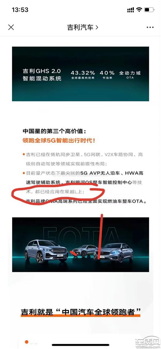吉利汽车销售公司在宣传承诺时的 《最后一公里无人泊车》 《车机5G网络》两项功能。从吉利星越L上市至今一直没有见到有更新,我们车主通过后台查到具备无人自主泊车功能,并且更新时间停留在2022年11月26日。后续再无任何更新,当初我们车主在买这个车的时候看中的是性价比,看中的是承诺有最后一公里无人泊车、看中的是车机5G网络。但是截至到发声明为止,车机经过多个版本迭代,均未出现上市时承诺的《最后一公里无人泊车》 《车机5G网络》功能。在同竞品车型中均有相同或者类似的功能,并且是在上市后直接搭载。