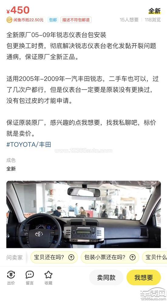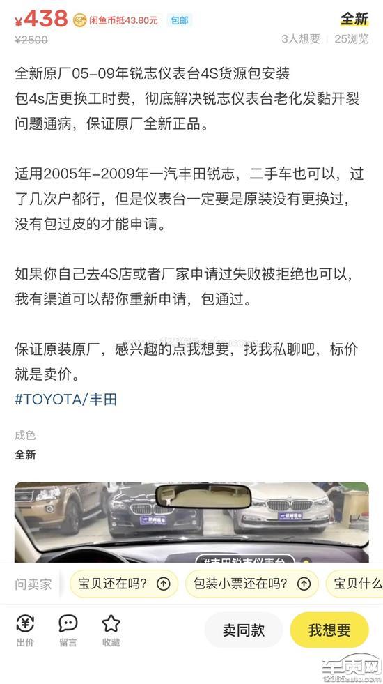 锐志仪表台开裂,上个月有投诉说厂家会联系我,至今没有收到联系,之前去4s店登记更换,大半年过去了配件一直说没货,突然有天打开闲鱼看到锐志仪表台花钱申请一个月内可以更换好,真是太无语了啊!