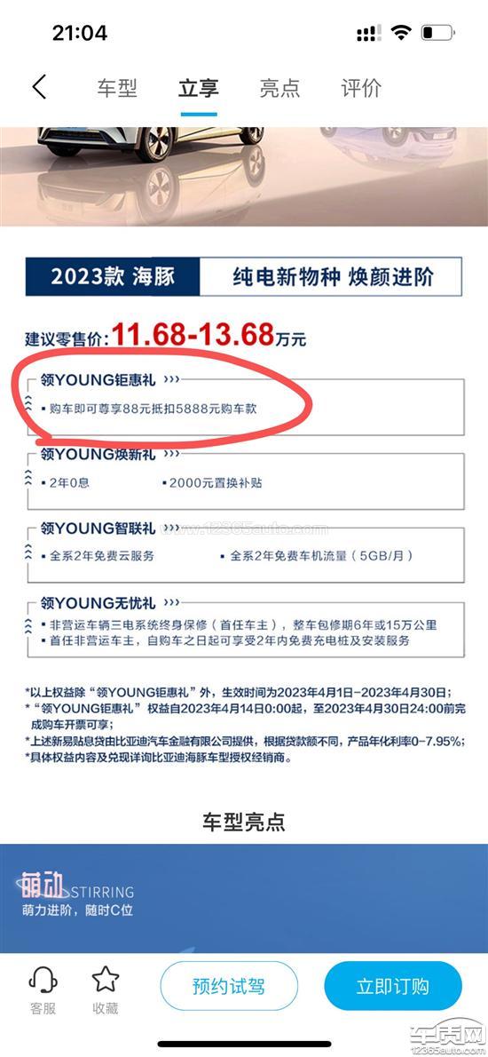 13号购买,购买当天,销售还说海豚不可能降价,14号官方公布88抵扣5888,14号晚我问销售,销售说88抵5888活动和国家政府补贴不能同时使用,19号到店问销售是否这个活动真的不能同时参加,销售又不肯正面回答,只是搪塞的说这几天没有人订海豚,说14号之前购买的客户,她们也觉得很抱歉,关键就一天时间,而且13号我提车,车子上还有个被石子崩到的小洞,我说不急着提,销售各种让我留下,让我当天就把车提了,想想太可气了,看网上已经有很多4月份(1号到13号购买)购买海豚的客户,已经享受到这个活动的补偿,希望我也能得到补偿,厂家说给回复,几天了,没有一点消息!