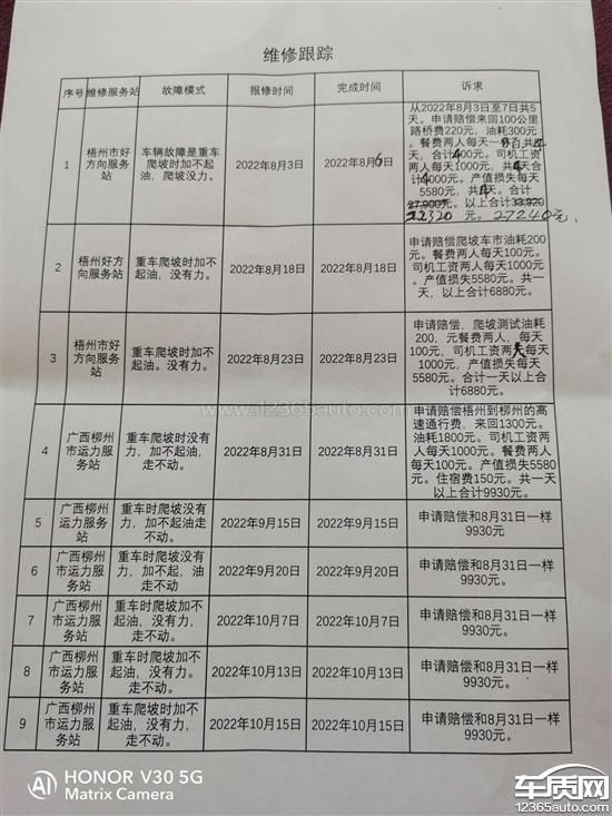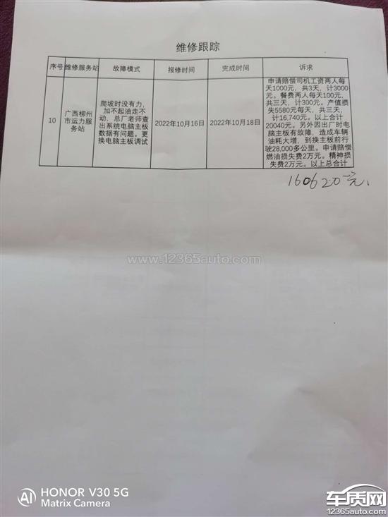 我于2022年7月28日提车进行运营,拉第1车货装了31吨次氯酸钠。低速爬坡的时候加不起油没有力。车辆怠速状态可以爬上坡。并于2022年8月3日第1次到广西梧州中国重汽服务站进行检测维修。到2022年8月6日都检查不出是什么故障原因。到2022年8月23日同一故障在广西梧州中国重汽服务站做了多次检测维修,都没检测出并解除故障。之后经销商又推荐到广西柳州中国重汽服务站进行检测维修。从2022年8月31日到2022年10月15日。同一故障又在广西柳州中国重汽服务站检测维修了五六次。依然没有找出故障并解决问题。之后我要求厂家派专家过来检测维修。2022年10月16日,中国重汽商用车,济南厂家派了两名专家过来对我的车辆进行检测维修。因广西柳州没有适合的场地进行检测。于是他们跟到广西梧州对我的车辆进行检测。在检测过程中,专家把自带的电脑数据输入到车的系统当中。车辆在爬坡当中突然动力十足。因此确定是车辆的电脑系统有问题。然后专家们把车的系统数据进行删除。并想把自带电脑当中的数据刻录到车的系统电脑当中。但刻录不上没有成功。之后断定是车的电脑系统主板有问题。因此联系济南厂家,空运了一块电脑主板过来。换上新的电脑主板经过一天调试之后,车辆动力恢复正常。换了电脑主板之后,在之后的运行当中车辆也多次出现故障灯亮动力不足的问题。检查当中发现线束的接头进水。形成短路。在2023年的4月中下旬。又换了三条短路之后的氮氧传感器2023年的5月6日又出现加不起,油动力不足,还有断油的现象。去广西梧州中国重汽服务站检测维修时发现线束短路。这台车从2022年的7月底到现在不到一年的时间,故障一直不断。这是严重的质量问题。我的诉求是在电脑主板有问题期间。反反复复的去两个售后服务站检测维修所造成的营运损失约6万元进行索赔。这6万元里面包括司机的工资,来回的路桥费,还有燃油费。