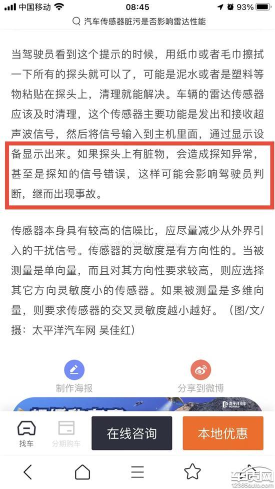 2023年4月10日提的车,4月17日晚上出去加油后回家,停车入库时,车辆原厂的360影像在晚上显示非常黑暗,没有夜视功能,车辆周围一片黑暗,观察受限,于是自己也倍加小心,然而让人意想不到的是,车辆在缓慢的倒车过程中突然受阻停住了,下车观察发现右前方已经与一辆车发生碰擦,而在碰擦之前车辆本身的预警功能完全没有启动,没有任何报警警示,后来看到泊车影像上有提示(如图三)“泊车传感器脏污”,因为车辆是在4s店贴的车衣,而车衣是全部覆盖住传感器的,提车时由于车衣刚贴好没有完全干透所以没有将覆盖的部位切割掉,销售倒是交代说过如果传感器发生无故报警现象就来店里把这部分切掉,但是我这个碰到东西之前反而不响,后来我又反复测试,发现这种情况是靠近障碍物时是时响时不响,说明它已经不正常不灵敏了,甚至是感应有些混乱,于是联系4s店去检测,工作人员说和这个没关系,并且车辆没问题,这个解释我很难接受,后来工作人员将车衣覆盖传感器的部分切除了,屏幕显示泊车传感器脏污就不提示了,一直到今天(2023年5月19日)这个不预警不报警不响的现象就没有了,所以我觉得这个问题还是服务不完善有关,我在网上查到(图4/5/6),雷达不响除了线路问题还有一个就是传感器脏污,我现在车辆为此发生的碰擦损失,车衣和一小块底漆受损,希望4s店给予解决。并请车质网的专业技术人员帮忙分析,主持公道,挽回我的损失,谢谢!