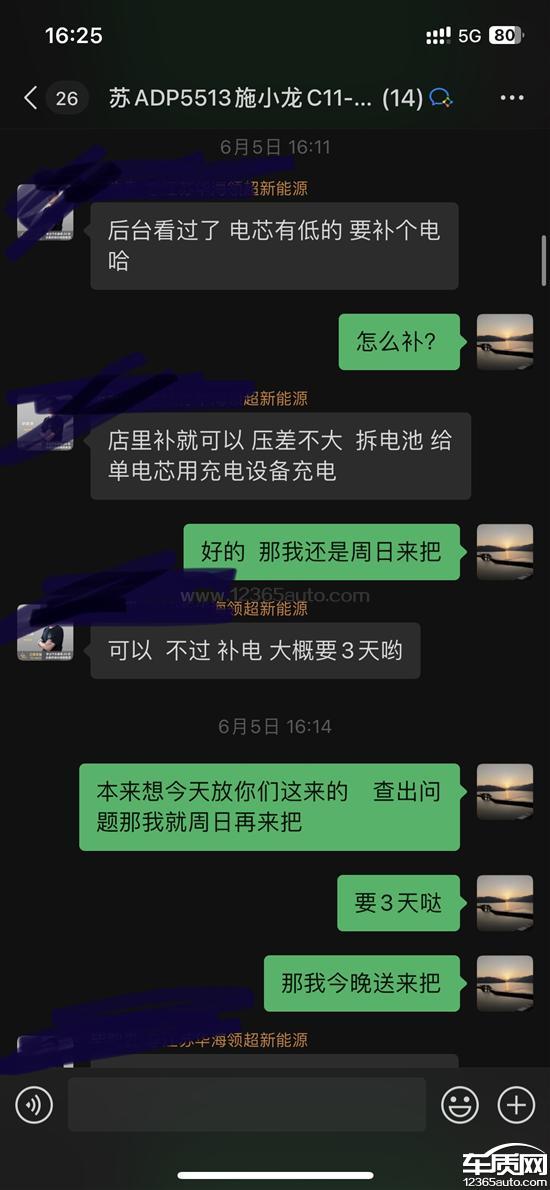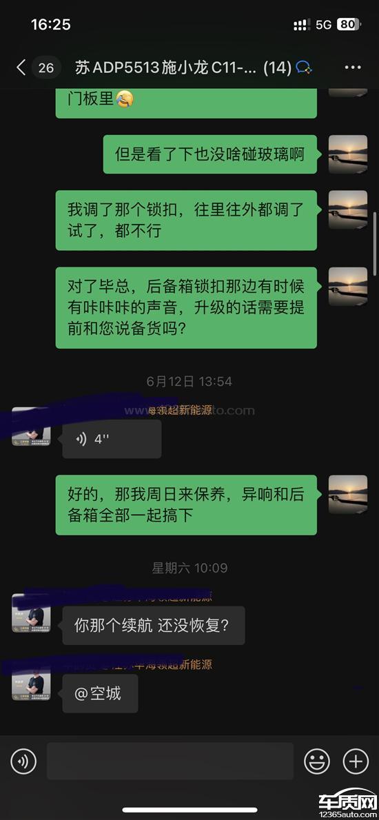 2022年6月购买,38500公里本人于2021年11月在江宁零跑订购了一辆零跑C11,当时看中了零跑承诺的整车终身质保和三电终身质保。由于零跑产能问题,于2022年6月在等待了七个月的情况下终于提车成功,但是在提车当月就遇到主驾驶升降异响问题,后换了内外胶条目前仍然存在异响问题。2023年1月,发现容量为78.5度的电池包充电容量仅仅为62度电,后在售后群里多次反映被告知没问题,甚至都没做检测,2023年3月,在多次反映后,江宁零跑4S店售后为我用电脑做了电池均衡,但是很遗憾,充电两次后又不行,此后于2023年4月和5月多次用电脑做电池soc均衡,均是两次充电后恢复异常,但是在售后群里多次反映后多次告知我正常,甚至都没看电池数据。2023年6月在我多次要求下,江宁零跑4S售后在和厂家沟通后查看电池数据,显示单体电压不均衡的情况,然后告知我需要单体补电两到三天。在补电后第二次充电后,又出现续航严重不足,充电不实的情况,售后又以后台数据正常为由,告知我正常,无法用有效的方法解决,只能多充电保证续航。诉求要求彻底解决电池异常问题,主副驾驶异响问题,实施厂家终身质保政策,按照国家三包法有关规定,确保消费者的正常权益。下图是有异常电池区间续航和正常电池续航以及售后回复记录。