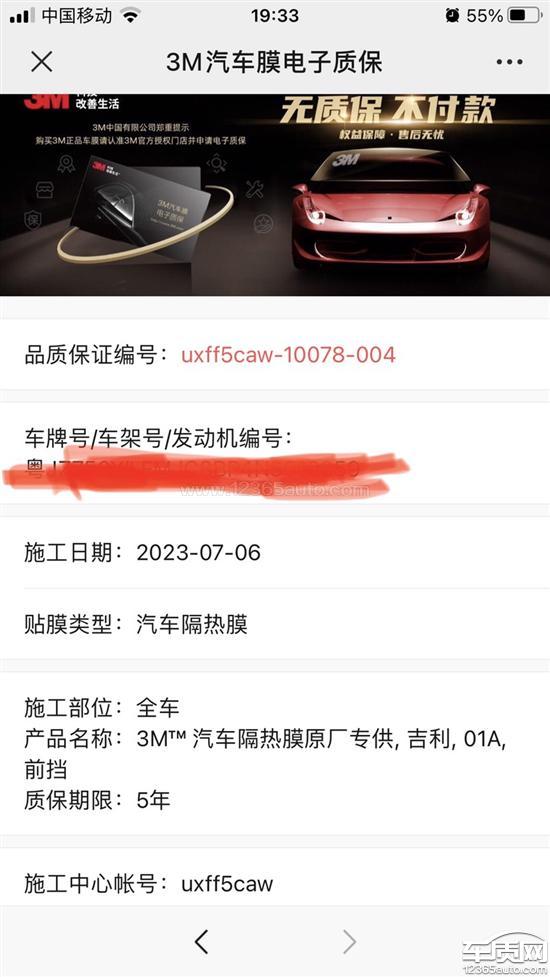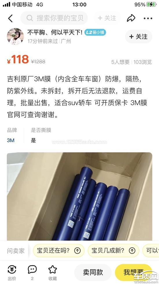 代金券1000和微信付款2000元购买了没型号的3M膜,后来查的该膜专供吉利汽车厂商的,应该为玥色系列。正常3M官方售价1000元左右。咸鱼卖118元整车。