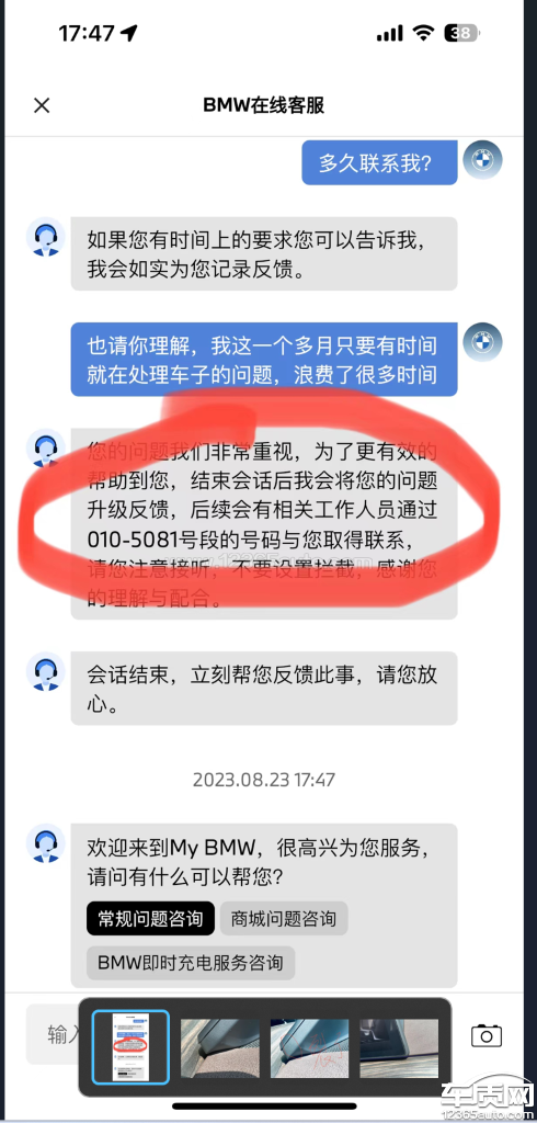 一、问题:车子一直是本人在开,车内未受任何撞击,中控面板及前边外壳无任何问题,但中控后边右下角外壳开裂;向MyBMWapp在线客服反映问题亦一直没有回应。二、处理过程:1、2023年7月22号,向4S店进行反映,4S向厂家反映问题,申请索赔。本人于7/25号收到4S店回复:“厂家没有回复如何处理,可能是原因不好界定”。本人与4S店表明,车子中控没有任何撞击痕迹,且中控前面板及面板外框均正常,只有后部右下角死角位置开裂,此位置也不可能碰的到。2、后本人8/21号上午直接在BMWAPP向在线客服反映开裂问题,在线客服回复厂家010-5081号段会联系我,至今已近3天过去了,仍无人联系我,8/23号下午又向厂家在线客服询问,仍然是登记信息并告诉我后边会有电话联系我。3、因车子为2020年10月购买的21款车型,至2023年10月初3年质保将过,严重怀疑宝马厂家故意拖延,不予处理。