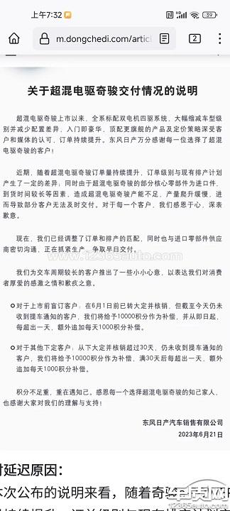 我于2023年6月13日在4S店交2万元用订购奇骏超混至尊版,4S店于7月26日通知提车。按照东风日产6月份发布补偿说明,对于超过30天未通知提车的客户是有商城积分补偿的。我多次打电话给东风日产客服反馈问题,他们确视而不见,不解决问题,不补偿积分。我已经上传了东风日产的补偿说明作为附件。