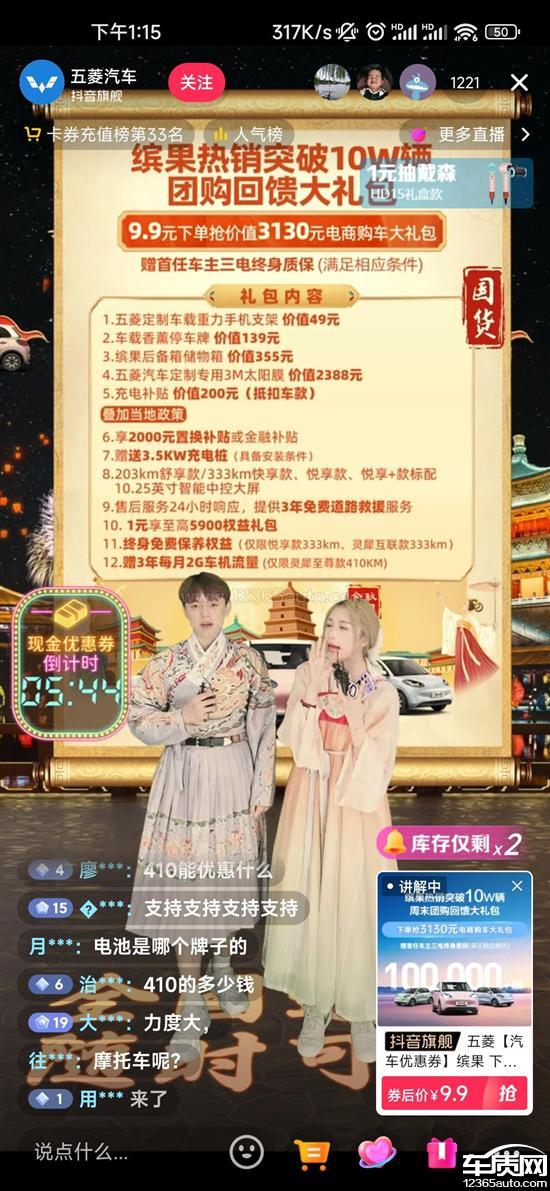 我于10月2日于抖音五菱汽车直播间购买了五菱缤果购车礼包优惠券,当时直播间显示购买五菱缤果可获得官方赠送2g黄金、950元交强险补贴以及3m太阳膜等赠品李,并承诺此礼包可叠加线下门店优惠。我于10月2日联系五菱4s店销售订车支付定金1000元,因店内无现车故需要等待车辆。订车期间并未谈及抖音直播间礼包的情况下得到车价优惠5500元政策,并于10月4日提车并开具发票,联系抖音直播间客服询问相应礼品的领取方式,客服回应950元交强险补贴已包含于车价优惠内,此举涉及欺诈消费者。然后3m太阳膜的赠送于10月4日也改成了410公里版本独享,我于10月2日下单时并未有此条款限制,有直播间截图为证,五菱此举属于擅自更改合同条款。