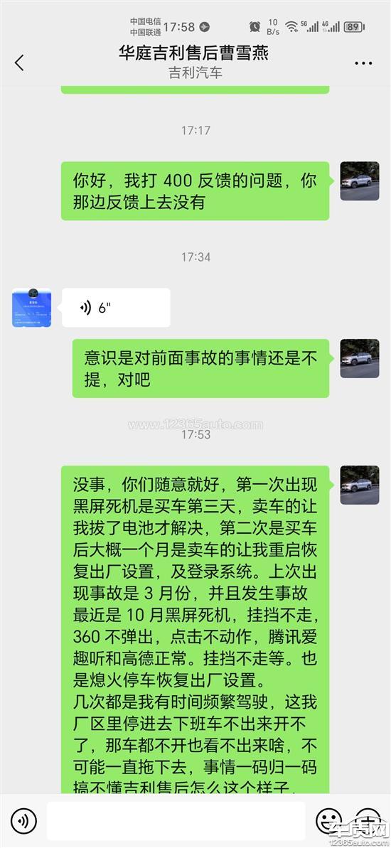 吉利汽车厂家回复:您的信息我们已经收到,将尽快协调相关4S店与您核实处理,厂家也将持续关注后续处理情况。感谢您的支持与谅解,如有疑问欢迎您致电吉利汽车客户服务热线:400-886-9888。