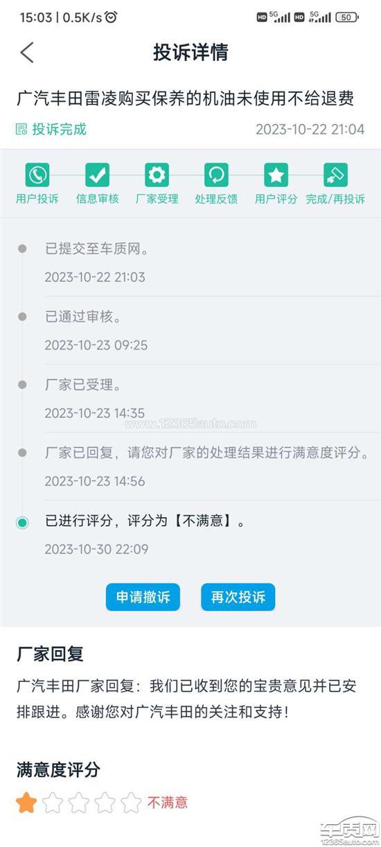 购车六年一直都在广汽丰田进行保养,售后员工的服务我都感觉挺满意的,因此大约在四年前他们有个保养活动是半价买机油活动我这边买了四桶机油打算长期在这家店进行保养,期间由于也有在4S店内买保险送机油(这些机油有效期只有一年,所以优先使用),因此这四桶机油一直没使用完,到今天(2023年10月22日)还剩一桶纯牌0W20四升的机油。由于我这台雷凌已经出售,剩余的一桶机油今天找到4S店要求进行按当初购买的价格退款或者直接拿走,售后经理出来解析我这边已经享受了三桶机油的服务了,剩余一桶机油厂家规定是不能拿走的,而且退款只能按机油未打折扣之前的原价退款,而我这个是参与了优惠,所以并不能退款等等理由一直不配合解决问题,期间态度还蛮横,声音还越讲越大,并且他主张的这项买三送一不能退款的服务条例又拿不出证据,而我购买这些机油的时候并未告知如未使用不能退款,因此我想通过车质网这个平台对这件事情进行投诉,我的要求就是剩余的一桶机油要不就按我当时购买的价格退款,要不就是提走实物机油。希望能通过车质网维护消费者权益,谢谢!这个投诉上周一(10月23日)厂家回复安排跟进,但一周过去了我这边没有收到任何反馈信息,麻烦帮忙确认目前进度如何,谢谢!