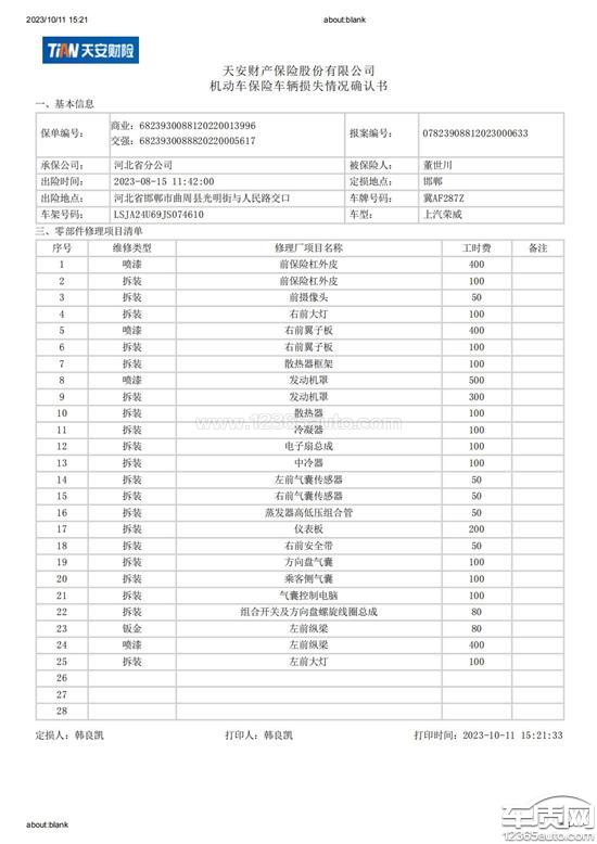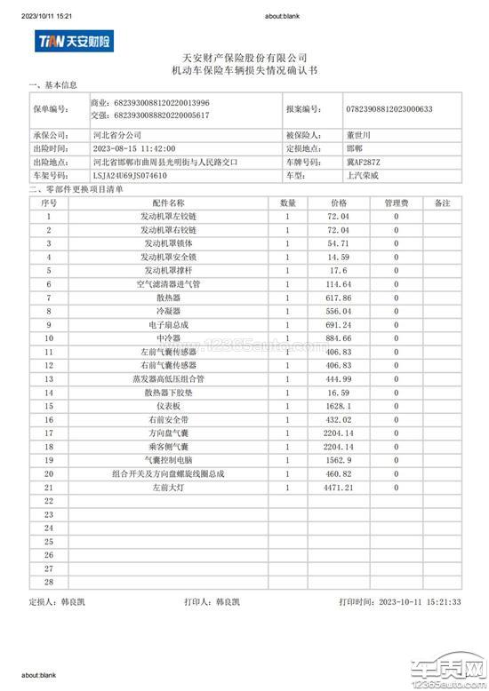 2023年8月15日在邯郸市曲周县发生交通事故,2023年9月11日交警队处理完毕,下达事故责任认定书,邯郸市4S店派人及拖车将车辆拖运至店铺进行维修,2023年9月27日维修完成,维修清单中显示全部为原厂件,保险公司定损清单中定损金额与维修清单一致,维修金额33500元,本人经查看,与维修前外观相差悬殊,后将车辆在石家庄4S店进行检查,得到回复非原厂件,经查上汽后台系统,只有两个大灯的出库记录,邯郸市4S店不予提供出库清单及电子版出库记录,所提供维修清单也无配件编号,经沟通无果,希望可以得到帮助,维护本人合法权益!已投诉一次,商家未与本人联系!请平台严肃处理,谢谢!