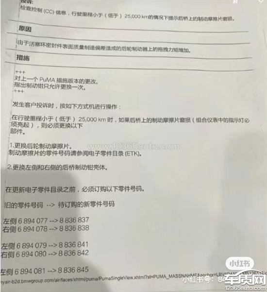 24600KM系统报警提示更换刹车片,2020年宝马技术通告显示:在行驶里程小于25000KM时,如果后桥上的制动摩擦片磨损(组合仪表中的指示灯必须亮起),则必须更换后轮刹车片以及左右两侧后桥制动钳壳体。