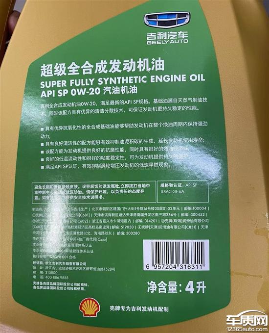 2023年购买吉利星23款,2.0T只此青绿版本,送四年保养。2023年11月第一次保养,没有使用黑桶sn机油和按保养手册(vccrbs0-2ae0w-20)的标准保养。保养用机油为黄桶sp不符合保养手册标准(黄桶sp机油剪切值小于2.0t发动机的2.75最小剪切值,存在达到高转速区间后出现油膜不能良好形成的情况,加速磨损,未来可能出现烧机油情况),打400吉利客服电话,厂家回复只是说两款机油都一样,不提符不符合保养标准的事,4s店也未说明机油是否符合标准(只是强调这是厂家机油)。黑桶sn背面印有VCCRBS0-2AEOW-20字样,有沃尔沃vcc认证,而黄桶sp则没有认证且。诉求:换回黑桶sn沃尔沃认证的标准机油,符合保养手册。