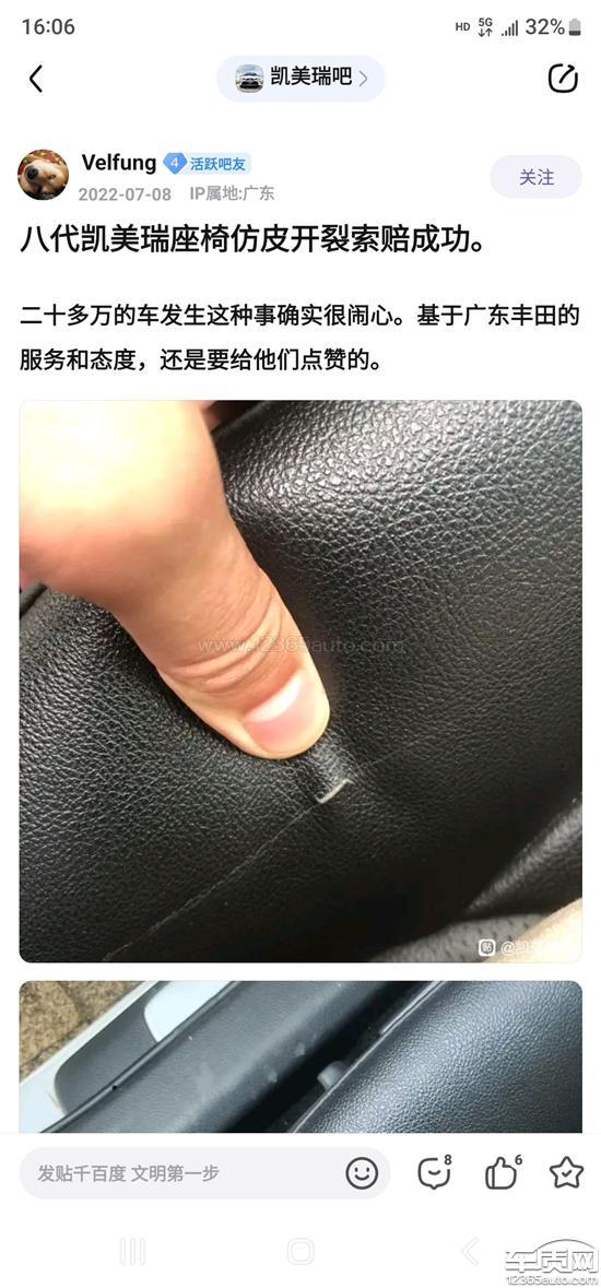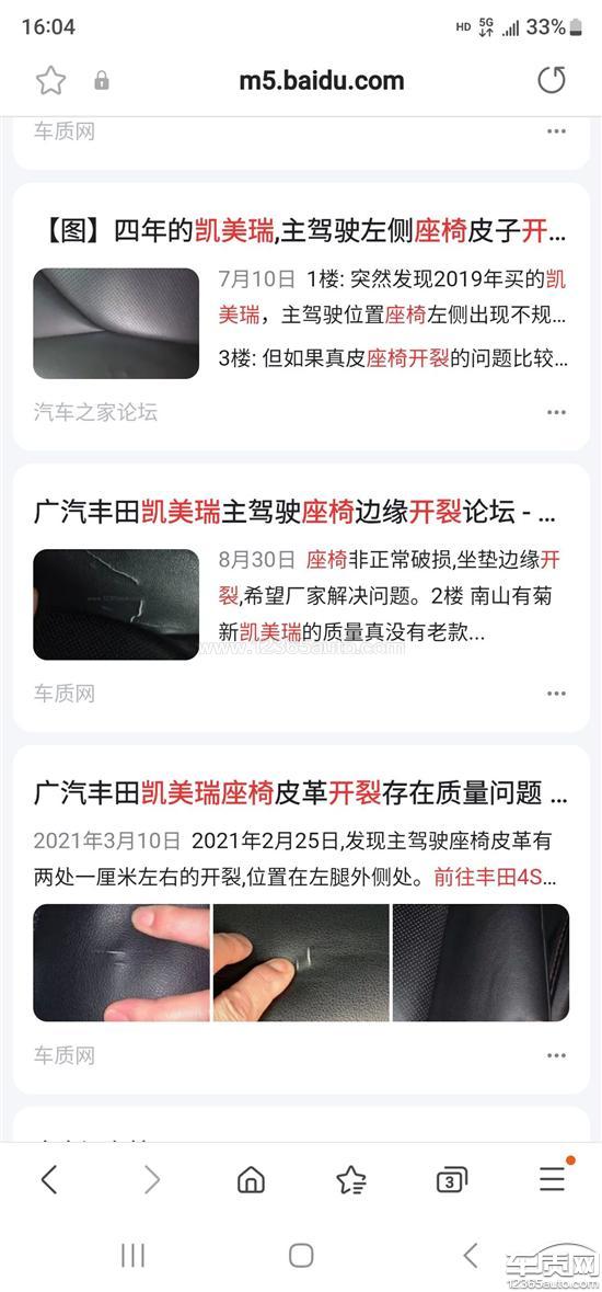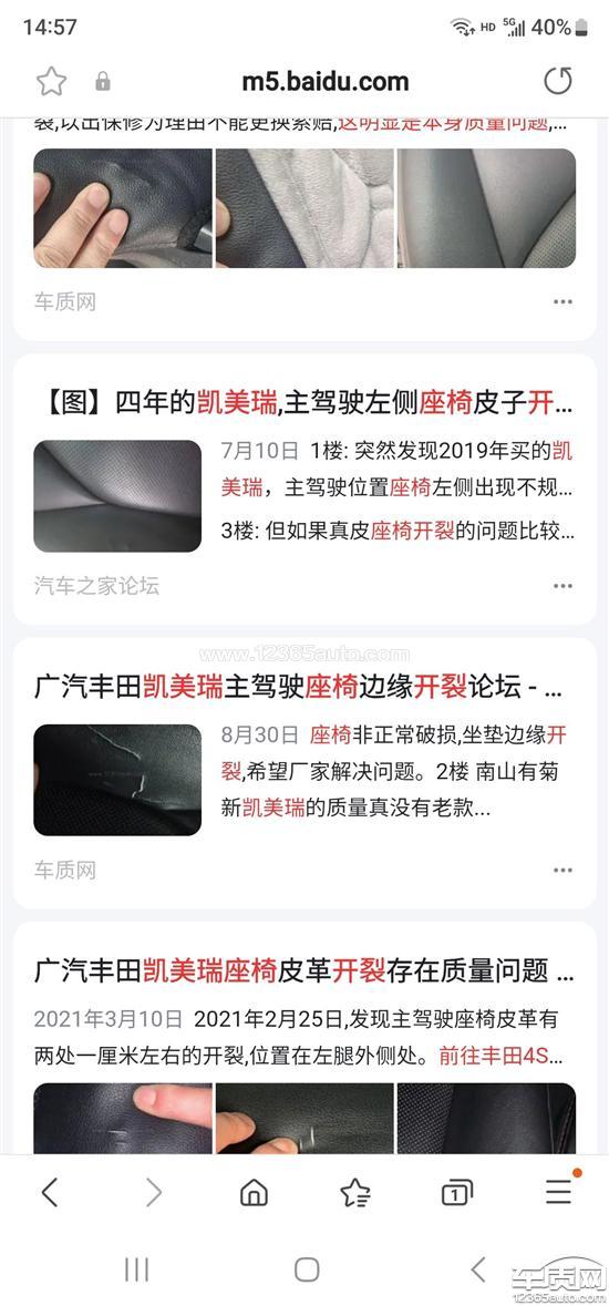 广汽丰田凯美瑞座椅褶皱的位置出现开裂