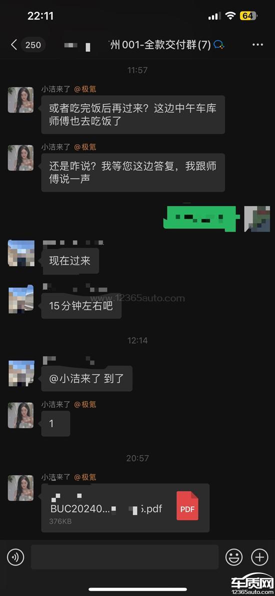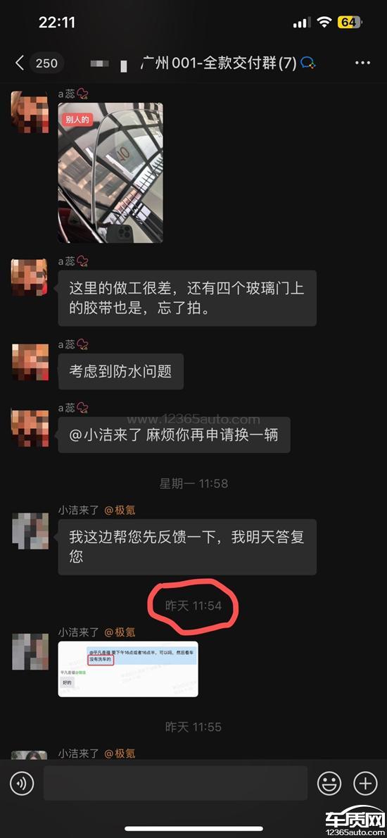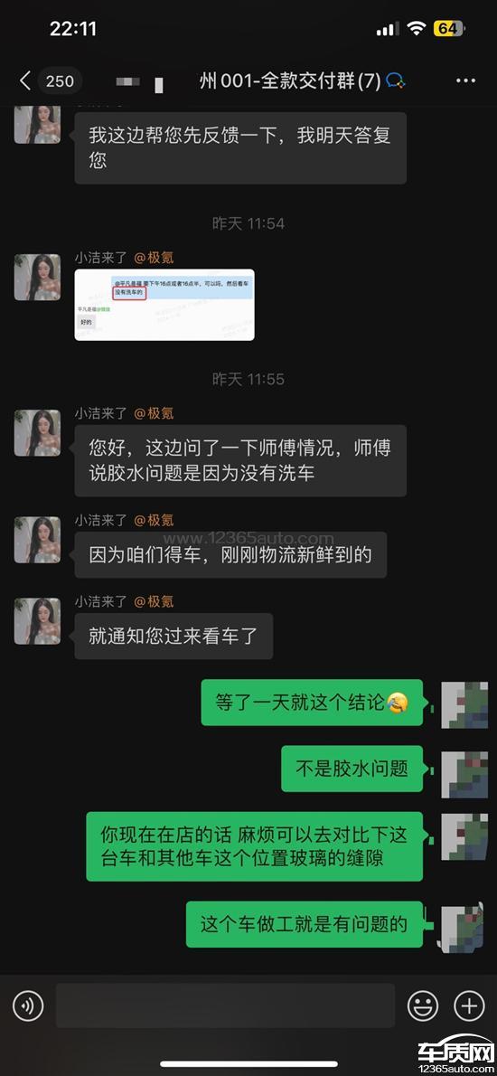 在交付通知验车后,去到店里验车时发现后挡风玻璃与车本身存在很大的缝隙,与店内正在交付的5台车进行对比,没有一台出现这个问题。反馈给交付工作人员,答复是做不了主,等了24小时后答复因为没有洗车,期间交付都是两个小时回复一次,见面聊态度也非常差,在谈不拢的情况下,当天晚上就提车催促函给我,必须4天内交尾款,不然终止订单,毕业工作三年刚刚够钱买一辆车,老百姓的钱也不是大风刮来的,交完定金的感受就是被强买强卖,直接把次品交付给我,感觉很无助,目前的诉求需要换一台不存在制作工艺有问题的新车。谢谢车质网工作人员。订单号:B0240107LN562R