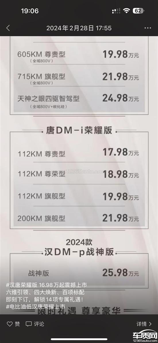 我于2023年9月购买比亚迪唐DMI冠军版尊荣,当时购车价21.98万,不到半年,比亚迪降价。现在新款价格更低,配置比原先还丰富,完全不管老车主,对老车主也不做出任何补偿。比亚迪这操作对市场产生巨大的影响,也是对老车主不负责的行为,让我感到失望和不公平,现在的荣耀版价格还低,配置比冠军版都高,我希望比亚迪能给出一些相对应的补偿!
