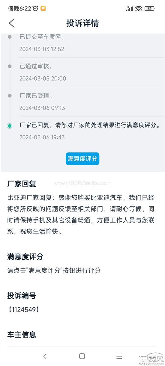 比亚迪厂家回复:感谢您购买比亚迪汽车,我们已经将您所反映的问题反馈至相关部门,请耐心等候,同时请保持手机及其它设备畅通,方便工作人员与您联系,祝您生活愉快。
