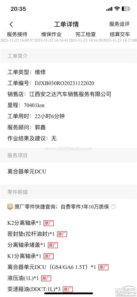 车子购买于2015年12月份,因为第一批干式双离合质量问题厂家给了8年20万公里的延保。该车于2020年出现过变速箱机电单元漏油,厂家只是打胶维修并没有更换整个部件。时间到快出质保期的2023年11月,4s打电话过来说:车子可以回店检修,当时车子变速箱只是有顿挫感(新车也有),4s店说可以进行变速箱维修换一些磨损零件(可见截图)减轻顿挫,我当时想车子也有7万多公里了,能免费换一些磨损件也挺好,车子放在4s店维修差不多一周。当时开着也没有什么问题,然后过了短短的一个多月,车子到80km时速的出现吹口哨的异响,当时也没有在意,现在车子到时速30的时候都有吹口哨的异响,在多家维修厂检测都说是变速箱里面异响。现在4s和厂家以出质保期为由拒绝理赔。因为这个变速器在5个月前更换过零件也维修过,维修装配工艺或零部件质量问题都会出现问题,而且这个干式双离合变速箱本身就存在质量缺陷,这辆车平时很爱惜,养护很好,8年多公里数也只有74000km。但是先后出现变速箱机电单元漏油、发动机漏油、下摆臂胶套脱漏、减震、方向机和顶胶易坏。这些问题并非个例。现在的诉求是希望厂家和4s店能解决车辆质量问题。