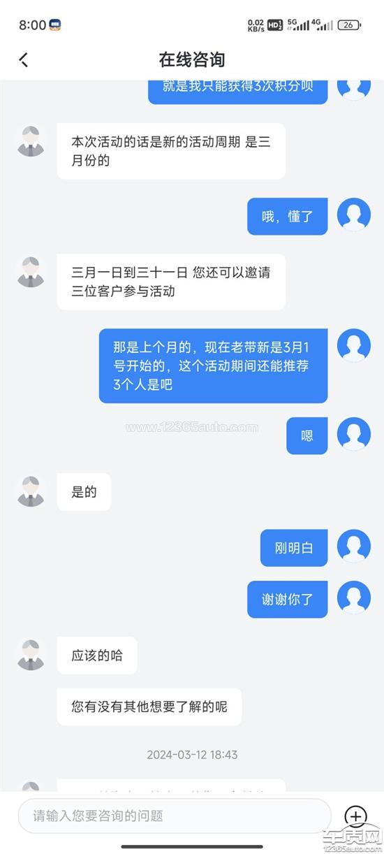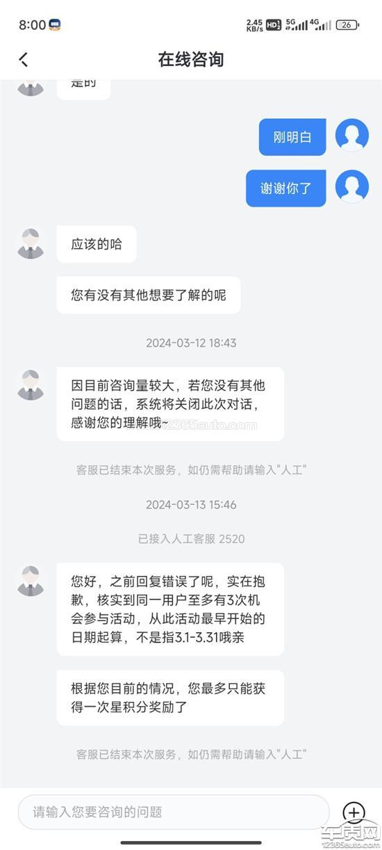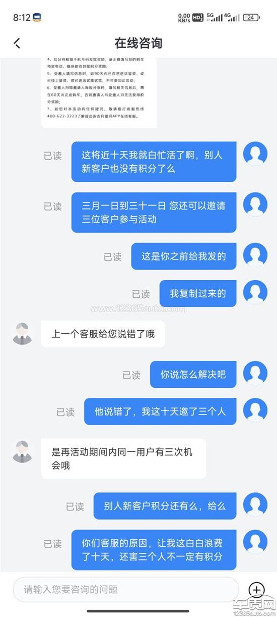 3月份吉利银河app里有老车主推荐新车主给6000积分的活动,年前我已经参加过过3次这个老带新的活动了,我专门问了一下吉利银河app里的官方客服,他明确的说我3月1号到31号还可以参加3次这个老带新的活动,后来我拉了3个人,结果客服来了一句他说错了,表示账户最多只能邀请3个人,不是从3月1号到31号还可以邀请3个人,这因为客服说错的原因,我这十天已经邀请了3个人了,现在有个新车主早已经提车了,积分还没到,人家现在问我要积分。因为客服回复错误的原因,让我们老车主和人家新车主买单,再找客服永远一句同一用户至多3次机会参与活动。