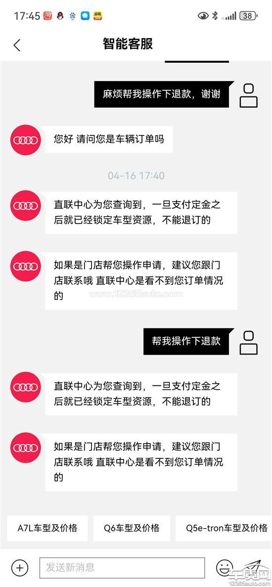 上汽奥迪厂家回复:经核查,授权代理商已经联系并协商沟通,沟通中了解到客户还存在购买意向,本周末授权代理商会再次邀约客户,如本周未能达成一致将与下周与客户协商认同的解决方案。