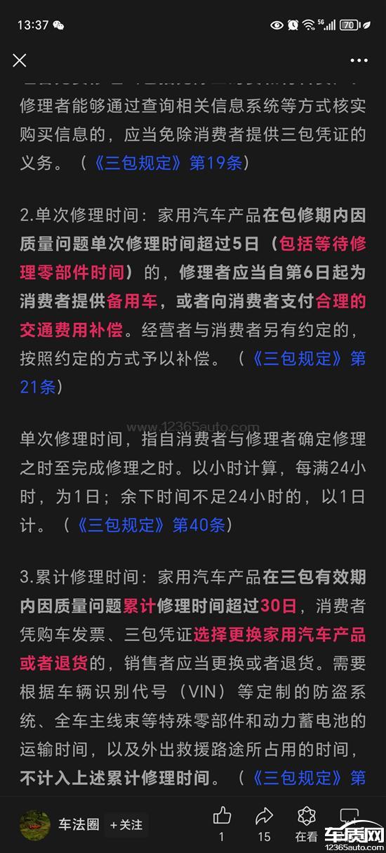 根据《家用汽车产品修理更换退货责任规定》第二十一条?家用汽车产品在包修期内因质量问题单次修理时间超过5日(包括等待修理零部件时间)的,修理者应当自第6日起为消费者提供备用车,或者向消费者支付合理的交通费用补偿。经营者与消费者另有约定的,按照约定的方式予以补偿。向厂家申请交通补助后,厂家以车辆送检后未停留在4s店为由拒绝交通补偿。但根据单次修理时间,指自消费者与修理者确定修理之时至完成修理之时。以小时计算,每满24小时,为1日;余下时间不足24小时的,以1日计。我6月8日与店里确定修理的,6月18日修理完的。固我的单次修理时间为10日!希望厂家依法依规。