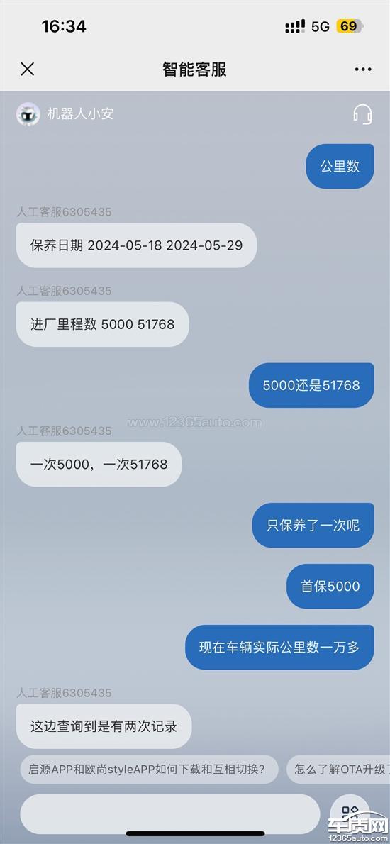 2024-05-18车辆5000公里首保,启源app查询公里数显示51768km,截止2024-08-06车辆实际公里数11319km。咨询4s店工作人员得到回复:系统查询保养记录是5000公里,app上公里数显示错误。后联系品牌客服得到回复:2024-05-18保养记录公里数5000公里,2024-05-29保养记录51768公里。再次询问4s店工作人员,让继续等待查询,且拿不出保养记录。现怀疑4s店欺骗消费者,将二手车当做新车售卖。或私自违法加减保养记录,恶意更改车辆公里数。