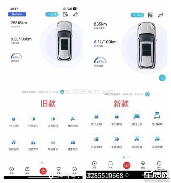 新款手机APP中,如上图所示,新增了解锁车门、解锁尾门等实用功能。然而,一直未给老车主更新新版本,导致很多实用功能未对老车主开放。要求一汽丰田一视同仁,为老车主开放服务。众多老车主花着更多的价格,却未享受到更多的服务,反而更少。要求一汽丰田正视问题,尽快解决。