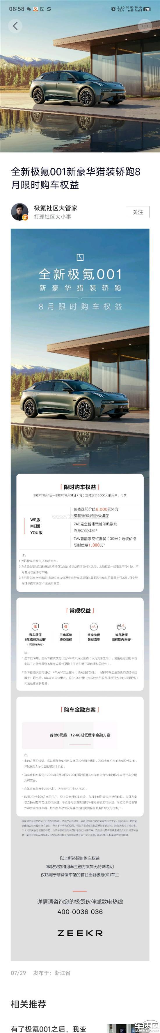 七月中与销售联系,七月30号下定,31号付款,八月九号提车极氪001we100。七月29号发布八月份权益,往常都是当月第一天才发布。发布后销售以八月权益大滑坡为切入点,对我们进行劝说,一直说要我们赶紧付钱。(销售也是被领导逼迫的,听销售说的)极氪官方及销售都说近期不会出新款,诱导消费者。极氪把八月权益取消,让销售鼓励我们七月买现车,原价消耗掉他们的24款库存车,并在我提车时间段开始卖展车,于八月11号正式官宣发布新车。并在发布会当天,关闭直播评论,且声称他们准备了大量的25款现车给新下定用户。极氪的一系列操作,明显是欺骗消费者,他们有预谋的通过调整权益,威逼利诱等手段,让支持极氪的车主消耗库存,同时提前生产新款车型,为发布然新车做准备。极氪涉嫌销售欺诈.诉求:对于这种无良企业进行监管。更换新车,由此引发的费用由极氪方支付。或者签保证书,极氪方承诺对我的24款有终生质保(车机智驾等),并对汽车贬值进行补偿:充电权益300度补偿且积分20w补偿。