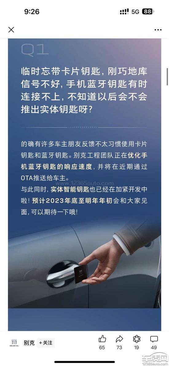 别克去年年中推出的别克新君越,其卡片钥匙因车辆响应不灵敏而广受诟病,导致部分意向购车人群望而却步。在2023年7月后的时间段,广大车友购买时,众多4S店销售人员为了提高销量,都或多或少声称后续会有实体钥匙,让车主安心购买。别克官方公众号《别克》在2023年9月15日18点58分发布的公众号文章《你问我答-全新一代君越答疑解惑》中提到:预计在2023年底或明年初(即2024年初)与大家见面。2.之后,别克官方为同期汽车产品别克E5、E4免费补发了实体遥控钥匙,但截至投诉日,别克官方仍未提供赠送或额外购买君越实体钥匙的方案,这给广大车友带来了不必要的麻烦。新君越在2023年购买时价格区间为18-24万元不等,车主们在价格高峰期购买,为支持别克新君越车型做出了贡献。别克此举,无疑辜负了新君越车主的支持和期待。3.现阶段,别克官方为众多4S店销售提供了统一话术,与车主们打太极,或称车辆无法安装无线响应模块,或称24.5款(即半代升级款)自带实体钥匙。甚至有车主尝试联系第三方安装配套设备,但被4S店以不提供质保为由拒绝安装。
